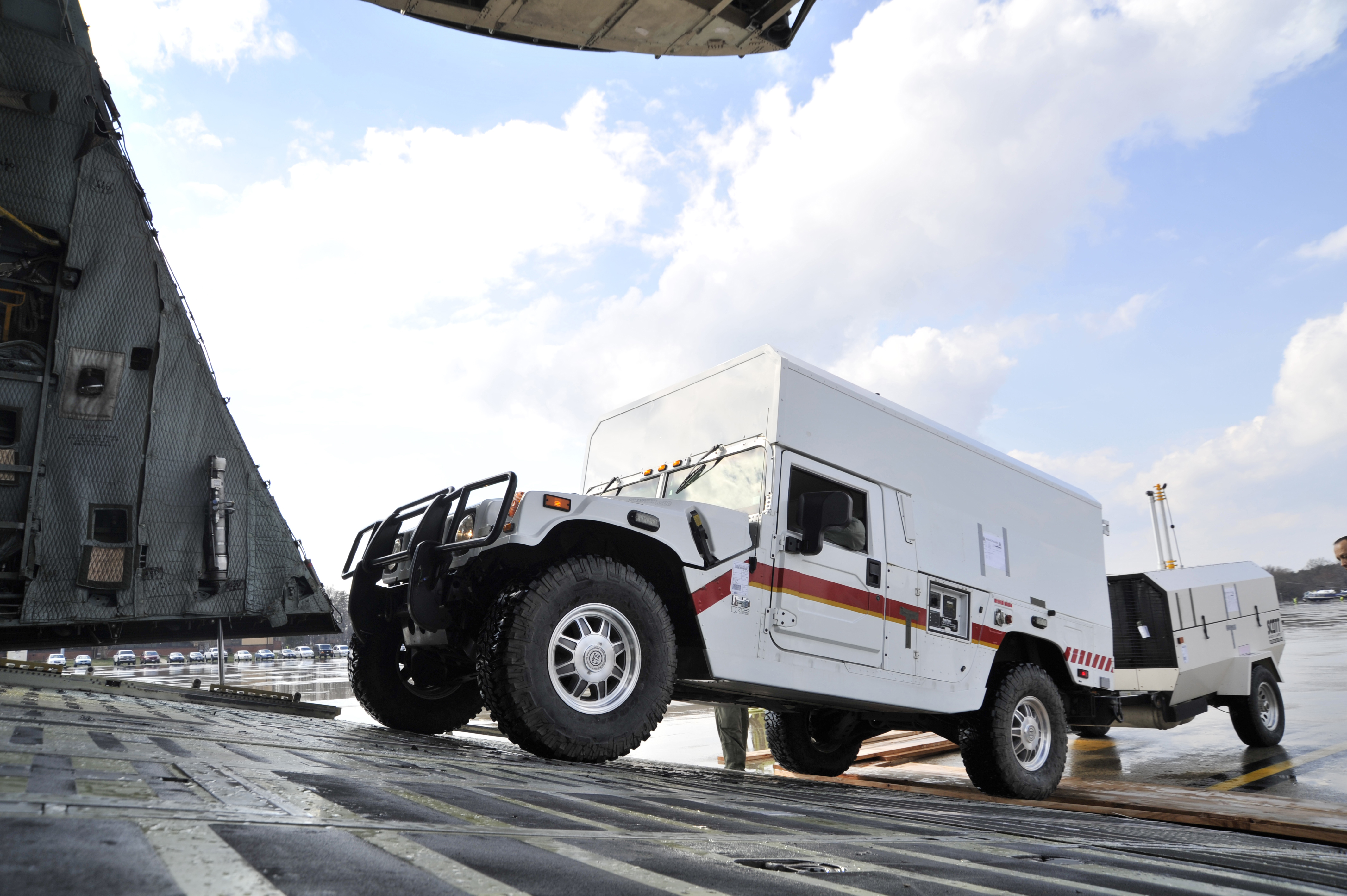 Marines from the II Marine Expeditionary Force, Chemical Biological Incident Response Force, Initial Response Force 'A' load CBIRF response vehicles onto a C-5 Galaxy bound for Japan, Apr. 1, 2011. Based at Naval Suport Facility Indian Head Maryland, CBIRF is a unit comprised of Marines and sailors specially trained to counter the effects of a chemical, biological, radiological, nuclear, and high-yeild explosive (CBRNE) incident. Usually, that intails being available to assist local, state and federal agencies with domestic emergency responses to CBRNE incidents. This is CBIRF's first overseas deployment since it was stood up in 1996 in response to the sarin attack on Tokyo subway in 1995. (Released)